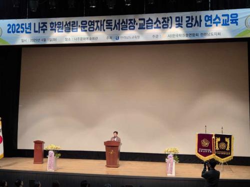 ³ªÁÖ±³À°Áö¿øÃ»(±³À°Àå º¯Á¤ºó)Àº 4¿ù 1ÀÏ(È­)¿¡ (»ç)Çѱ¹ÇпøÃÑ¿¬ÇÕȸ Àü¶ó³²µµÁöȸ¿¡ À§Å¹ÇÏ¿©, °ü³» Çпø¡¤±³½À¼Ò ¿î¿µÀÚ ¹× °­»ç ¾à 500¸íÀ» ´ë»óÀ¸·Î ³ªÁÖ¹®È­¿¹¼úȸ°ü¿¡¼­ 2025³âµµ Çпø¡¤±³½À¼Ò ¿î¿µÀÚ ¹× °­»ç ¿¬¼ö¸¦ °³ÃÖÇÏ¿´´Ù.