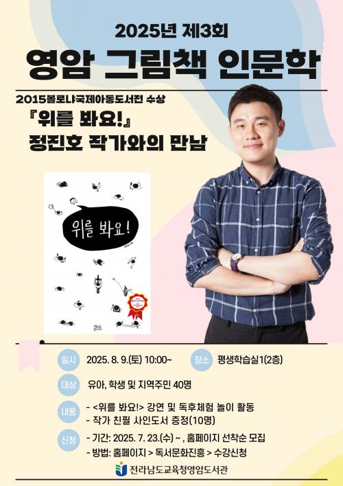 Àü¶ó³²µµ±³À°Ã»¿µ¾Ïµµ¼­°ü(±¸. ¿µ¾Ï°ø°øµµ¼­°ü)Àº ¿À´Â 8¿ù 9ÀÏ(Åä) ¿ÀÀü 10½Ã, 2025³â Á¦3ȸ ¿µ¾Ï ±×¸²Ã¥ Àι®ÇÐ Á¤ÁøÈ£ ÀÛ°¡¿ÍÀÇ ¸¸³²À» ¿î¿µÇÑ´Ù.