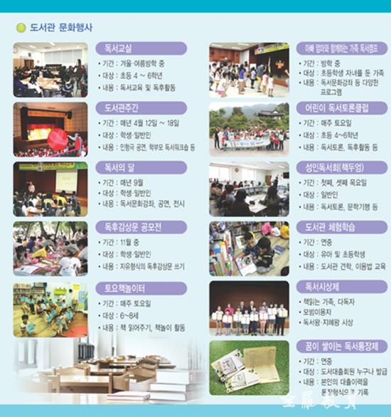 ¶ÇÇÑ, Áö½ÄÁ¤º¸È ÀÎÇÁ¶ó ±¸Ãà, ÄèÀûÇÏ°í Æí¸®ÇÑ µµ¼°ü ȯ°æ Á¦°ø, ÀÚµ¿È±â±â¸¦ Ȱ¿ëÇÑ ´ëÃâ ¼ºñ½º Áõ´ë, RFID µµ¼Á¤º¸½Ã½ºÅÛ ¿î¿µ, 365 µµ¼°ü ÄÚ³Ê, ¹«Àεµ¼¹Ý³³±â ¿î¿µ, Ã¥¹Ù´Ù(»óÈ£´ëÂ÷¼ºñ½º) ¿î¿µ µî ÀÌ¿ëÀÚ Áß½ÉÀÇ µµ¼°üÀ» ¸¸µé¾î ³ª°¡°í ÀÖ´Ù. ã¾Æ°¡´Â µ¿È¼ö¾÷, ¾î¸°ÀÌ ºÏŬ·´, Åä¿äÃ¥³îÀÌÅÍ, µµ¼°üüÇèÇнÀ, ¼ºÀÎ µ¶¼È¸, ¼øÈ¸¹®°í ¿î¿µ, ºÎ¸ð¿Í ÇÔ²²ÇÏ´Â µ¶¼°¡Á·Ä·ÇÁ ¿î¿µ µîÀ¸·Î µ¶¼ ¹®È ±â¹Ý Á¶¼º¿¡µµ Èû¾²°í ÀÖ´Ù.