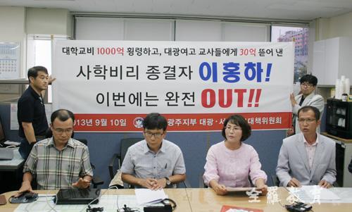 Àü±¹±³Á÷¿ø³ëµ¿Á¶ÇÕ(ÀÌÇÏÀü±³Á¶) ±¤ÁÖÁöºÎ´Â 10ÀÏ ±¤Áֽñ³À°Ã» ºê¸®Çη뿡¼ ¡°'´ëÇб³ºñ 1000¾ï Ⱦ·É, ´ë±¤¿©°í ±³»çµé¿¡°Ô 30¾ï ¶â¾î³½ »çÇкñ¸® Á¾°áÀÚ Out'"À» ÁÖÀåÇÏ´Â ±âÀÚȸ°ßÀ» °¡Á³´Ù.