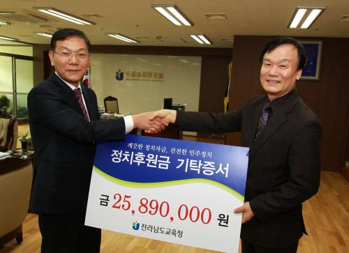 Àü³²µµ±³À°Ã»(±³À°°¨ À常ä)Àº 30ÀÏ ±³À°°¨½Ç¿¡¼ °øÁ¤ÇÑ ¼±°Å¹®È Á¤ÂøÀ» À§ÇØ À常ä ±³À°°¨À» ºñ·ÔÇÑ µµ±³À°Ã» °ø¹«¿ø 294¸íÀÌ ¸ðÀº 2,589¸¸¿øÀÇ Á¤Ä¡ÈÄ¿ø±ÝÀ» Àü¶ó³²µµ¼±°Å°ü¸®À§¿øÈ¸¿¡ ±âŹÇß´Ù.