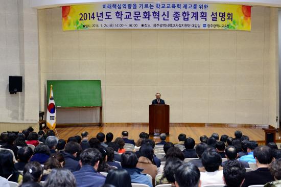 ÀåÈÖ±¹ ±¤ÁÖ±¤¿ª½Ã±³À°°¨Àº 1¿ù 24ÀÏ(±Ý) ¿ÀÈÄ ±¤»ê±¸ ½Å⵿ Çб³½Ã¼³Áö¿ø´Ü ´ë°­´ç¿¡¼­ ¿­¸° "2014³âµµ Çб³¹®È­Çõ½Å Á¾ÇÕ°èȹ ¼³¸íȸ" Âü¼® Àλ縻À» ÇÏ°í °ü°èÀÚµéÀ» °Ý·ÁÇß´Ù.