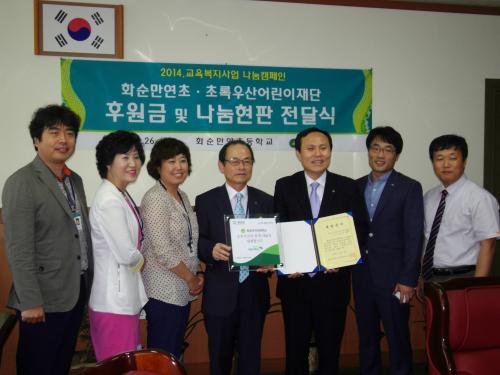 ȼø¸¸¿¬ÃʵîÇб³(±³Àå ±è±æµµ)¿¡¼´Â 26ÀÏ ÃÊ·Ï¿ì»ê¾î¸°ÀÌÀç´Ü ³ª´® Ä·ÆäÀÎ ÈÄ¿ø±Ý ¹× ³ª´® ¿ì¼ö±â°ü ÇöÆÇ Àü´Þ½ÄÀ» °¡Á³´Ù°í ¹àÇû´Ù. À̹ø Çà»ç´Â ±³À°º¹Áö»ç¾÷°ú ¿¬°èÇÏ¿© 3³â° ÈÄ¿øÀ» ÁÖ°í¹Þ´Â ÃÊ·Ï¿ì»ê¾î¸°ÀÌÀç´Ü ÃÖ¿µÃ¶ º»ºÎÀåÀ» ºñ·ÔÇÑ °ü°èÀÚ ¹× ±³Á÷¿øÀÌ ÀÚ¸®ÇÑ °¡¿îµ¥ º»±³ ³ª´® Ä·ÆäÀÎÀ» ÅëÇØ ¸ð¾ÆÁø ÈÄ¿ø±ÝÀ» Àü´ÞÇϰí Àç´ÜÀ¸·ÎºÎÅÍ ³ª´® ¿ì¼ö±â°ü ÇöÆÇÀ» Àü´Þ¹Þ¾Ò´Ù.