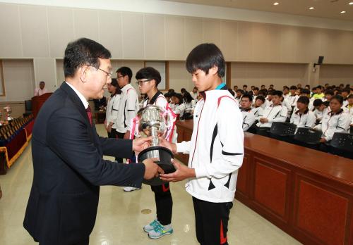 ±×¸®°í, 3°ü¿Õ¿¡ ¿À¸¥ ¿ªµµ ÀÓÁø°(¿ÏµµÁß 3³â)¼±¼ö¿Í ´ëȸ 2¿¬ÆÐ¸¦ Â÷ÁöÇÑ À°»ó Á¤¼Èñ(±¤¾ç¹é¿îÁß 2³â)¼±¼ö¸¦ ºñ·ÔÇÑ ±Ý¸Þ´Þ ÀÔ»ó¼±¼ö 27¸í, Àº¸Þ´Þ ÀÔ»ó¼±¼ö 55¸í, µ¿¸Þ´Þ ÀÔ»ó¼±¼ö 84¸í ÃÑ166¸í¿¡°Ô ÀåÇбÝÀ» Àü´ÞÇÏ¿´À¸¸ç, Çб³¿îµ¿ºÎÁöµµÀÚ¿¡°Ôµµ ¼ÒÁ¤ÀÇ Àå·Á±ÝÀ» Áö±ÞÇÏ¿´´Ù.