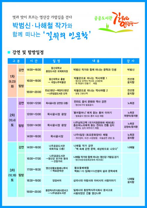 ¶ÇÇÑ ³ªÁÖÁö¿ªÃâ½Å ³ªÇØÃ¶ ½ÃÀΰú ÇÔ²² ¡®¿µ»ê°­ °¡¶÷±æ °È±â¡¯, ¡®È²Æ÷µÀ¹èüÇ衯, ¹éÈ£¹®Çаü, ¾Ó¾Ï¹ÙÀ§ µîÀ» ޹æÇÏ¿© ¿µ»ê°­ À¯¿ªÀÇ ¿ª»ç¿Í °í´ë¹®È­¸¦ ´À²¸º¼ ¼ö ÀÖ´Ù.