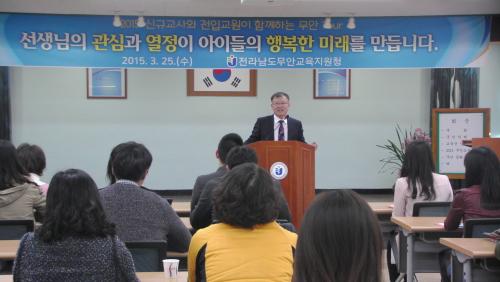 Àü¶ó³²µµ¹«¾È±³À°Áö¿øÃ»(±³À°Àå ¼Û¿ë¼®)Àº 2015.03.25.(¼ö)¿¡ 3¿ù 1ÀÏÀÚ·Î ¹«¾È±º¿¡ ÀüÀÔÇØ¿Â ±³¿ø ¹× ½Å±Ô ±³»ç 80¸íÀ» ´ë»óÀ¸·Î¡®¹«¾È±³À° 2015¡¯¾È³»¿Í °íÀåÀÇ Æ¯»öÀ» ¼Ò°³ÇÏ´Â ¡®½Å±Ô(ÀüÀÔ) ±³¿ø°ú ÇÔ²²ÇÏ´Â ¹«¾È ¹Ù·Î¾Ë±â¡¯ Çà»ç¸¦ °¡Á³´Ù.¡®¼±»ý´ÔÀÇ °ü½É°ú ¿Á¤ÀÌ ¾ÆÀ̵éÀÇ ÇູÇÑ ¹Ì·¡¸¦ ¸¸µì´Ï´Ù.¡¯¶ó´Â ÁÖÁ¦·Î °³ÃÖµÈ ÀÌ ¿¬Âùȸ´Â ¹«¾È±³À° ¹× Áö¿ª»çȸ ÀÌÇØ¸¦ µ½±â À§ÇØ ¸¶·ÃµÇ¾ú´Ù.
