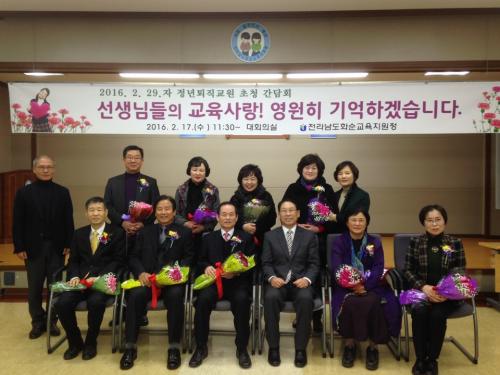 Àü¶ó³²µµÈ­¼ø±³À°Áö¿øÃ»(±³À°Àå ±Ç¿µ±æ)Àº 2¿ù 17ÀÏ(¼ö) 2016. 2. 29.ÀÚ·Î ¿µ¿¹·Ó°Ô Á¤³âÅðÀÓÇÏ´Â È­¼ø¸¸¿¬ÃʵîÇб³ ±è±æµµ ±³Àå¼±»ý´ÔÀ» ºñ·ÔÇÑ ÃʵîÇб³ ±³Àå¼±»ý´Ô 5¸í, Ãʵ»ç 5¸í, Áߵ»ç 1¸í, ÃÑ 11¸íÀÇ ±³¿øµé°ú °£´ãȸ¸¦ °¡Á³´Ù