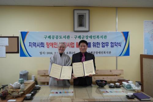 ±¸·Ê°ø°øµµ¼°ü(°üÀå ¹ÚÁ¤Èñ)Àº 2¿ù 23ÀÏ(È) ±¸·Ê±ºÀå¾ÖÀκ¹Áö°ü°ú Áö¿ª»çȸ Àå¾ÖÀÎ º¹Áö»ç¾÷ Ȱ¼ºÈ¸¦ À§ÇÑ ¾÷¹« Çù¾àÀ» ü°áÇß´Ù.