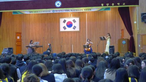 ÷´ÜÁßÇб³(±³Àå ±èÀ±¹è)´Â 3¿ù 22ÀÏ(È) Àü±³»ý°ú ±³Á÷¿ø, Çкθ𸦠´ë»óÀ¸·Î ÀμºÇÔ¾ç°ú Çб³Æø·Â¿¹¹æÀ» À§ÇÑ ½ÅÃáÀ½¾Çȸ¸¦ ¿¾ú´Ù. À̹ø ½ÅÃáÀ½¾Çȸ´Â À۳⿡ ÀÌ¾î ¿ÃÇØ µÎ ¹øÂ°·Î ¿¸° °ÍÀ¸·Î Ŭ·¡½Ä ¾Ç±âÀÇ ¼±À²°ú ¾Æ¸§´Ù¿î ¿ì¸® °¡°îÀÌ Ã»¼Ò³â±â¿¡ ÀÖ´Â ¿ì¸® ÇлýµéÀÇ Á¤¼ ÇԾ翡 ÁÁÀº ¿µÇâÀ» ÁÖ¾ú´Ù°í Æò°¡¹Þ°í ÀÖ´Ù.
