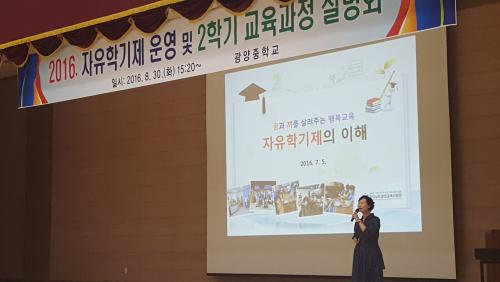 ¿¬¼öÀÇ ³»¿ëÀº ³ª¿µ¼÷ ±³À°Áö¿ø°úÀå´ÔÀÇ ÀÚÀ¯ÇбâÁ¦ÀÇ °³³ä°ú ºñÀü ¹× ¸ñÇ¥, Á¤Ã¥¹æÇâ¿¡ ´ëÇÑ ÀÚ¼¼ÇÑ ¾È³»¿Í ÇÔ²², ÀÚÀ¯ÇбâÁ¦ ¿î¿µÃ¼Á¦ ¹× ÆíÁ¦¿¡ ´ëÇØ ¾Ë±â ½±°Ô ¼³¸íÇÏ´Â ÇÑÆí, ÁßÇб³ Çкθð·Î¼­ °ü½ÉÀ» °¡Á®¾ß ÇÒ ±³À°°úÁ¤¿¡ ´ëÇØ¼­µµ ÇкθðÀÇ ´«³ôÀÌ¿¡ ¸ÂÃß¾î ±¸Ã¼ÀûÀ¸·Î ¾È³»ÇÏ¿´´Ù.