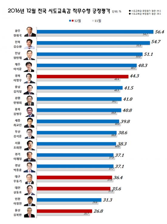 ÀåÈÖ±¹ ±³À°°¨Àº 12¿ù Àü±¹ ½Ã¡¤µµ ±³À°°¨ Á÷¹«¼öÇà ÁöÁöµµ¿¡¼ 11¿ù ´ëºñ 2.2%p »ó½ÂÇϸç 56.4%ÀÇ ÁöÁöÀ²·Î 1À§¸¦ ±â·ÏÇß´Ù. ±è½Âȯ ÀüºÏ±³À°°¨Àº 3.7%p »ó½ÂÇÑ 54.7%·Î 2À§¸¦ ÁöÄ×°í, À常ä Àü³²±³À°°¨Àº 0.3%p »ó½ÂÇÑ 51.1%·Î 3À§¸¦ À¯ÁöÇß´Ù.