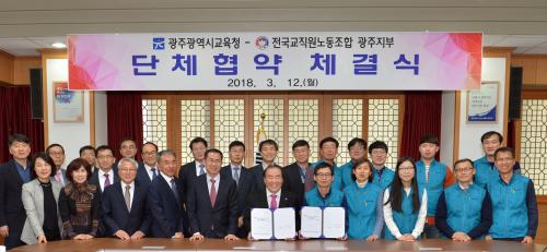 12ÀÏ ±¤Áֽñ³À°Ã»¿¡ µû¸£¸é À̳¯ ¿ÀÈÄ 4½Ã ÀåÈÖ±¹ ±³À°°¨°ú Á¤¼ºÈ« ±¤ÁÖÁöºÎÀå µî 30¿© ¸íÀÌ Âü¼®ÇÑ °¡¿îµ¥ ¡®2017 ´ÜüÇù¾à¡¯À» ü°áÇß´Ù. ƯÈ÷ À̹ø ´ÜüÇù¾àÀº Áö³ 2013³â Á¤ºÎ°¡ ÇØÁ÷ÀÚ¸¦ ±¸¼º¿øÀ¸·Î µÎ°í ÀÖ´Ù´Â ÀÌÀ¯·Î Àü±³Á¶¿¡ ¡®¹ý»ó ³ëÁ¶ ¾Æ´Ô¡¯À» Å뺸ÇÑ ÀÌÈÄ Ã³À½ ü°áµÈ °ÍÀ̸ç, 2012³â ´ÜüÇù¾à ÀÌÈÄ 6³â ¸¸ÀÌ´Ù.