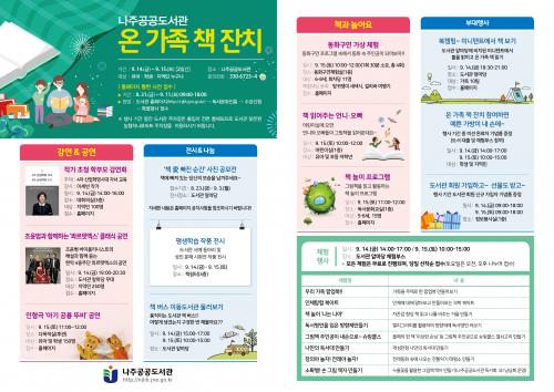 ³ªÁÖ°ø°øµµ¼­°ü(°üÀå ÀÌÇõ½Å)Àº 9¿ù µ¶¼­ÀÇ ´ÞÀ» ¸ÂÀÌÇÏ¿© µµ¼­°ü ÀÏ¿ø¿¡¼­ 9¿ù 14ÀÏ~15ÀÏ ÀÌÆ²°£ ¡®¿Â °¡Á· Ã¥ ÀÜÄ¡¡¯¸¦ ¿î¿µÇÑ´Ù.