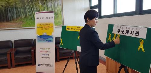 Á÷¿øµéÀº ¼¼¿ùÈ£ Èñ»ýÀÚ¸¦ ±â¸®´Â ³ë¶õ ¸®º»¿¡ ¡®½½ÇÄÀ» ³Ñ¾î Èñ¸ÁÀ¸·Î¡¯, ¡®¸ðµç »ý¸íÀÌ ¶È°°ÀÌ Á¸Áß¹Þ´Â ¼¼»óÀ» À§ÇÏ¿©¡¯, ¡®³ª¶ó´Ù¿î ³ª¶ó Çб³´Ù¿î Çб³¡¯, ¡®¿ì¸®ÀÇ ½½ÇÄÀÌ º¯È­ÀÇ ÈûÀ¸·Î¡¯ µîÀ¸·Î ¼¼¿ùÈ£ Ã߸ð±â°£À» ¸ÂÀº ´ÙÁüÀ» Ç¥ÇöÇÏ¿´´Ù.