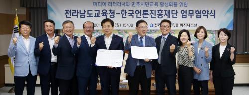 Àü³²±³À°Ã»Àº 8ÀÏ ¿ÀÈÄ µµ±³À°Ã»¿¡¼­ Çѱ¹¾ð·ÐÁøÈïÀç´Ü°ú ¾÷¹«Çù¾àÀ» ü°áÇϰí, ¹Ìµð¾î¿Í Á¤º¸ È«¼ö ¼Ó¿¡¼­ Á¤º¸ ºÐº°·ÂÀ» Ű¿ì´Â ¹Ìµð¾î¸®ÅÍ·¯½Ã(¹Ìµð¾î ¹®ÇØ·Â) ±³À°À» °­È­ÇØ ³ª°¡±â·Î Çß´Ù. Çù¾à½Ä¿¡´Â Àå¼®¿õ ±³À°°¨À» ºñ·ÔÇÑ µµ±³À°Ã» °£ºÎ¿Í Çѱ¹¾ð·ÐÁøÈïÀç´Ü ¼Õµ¿¿ì °æ¿µÀÌ»ç µî 10¿© ¸íÀÌ Âü¼®Çß´Ù.