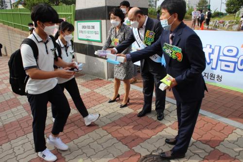 ÀÌ ³¯ Çà»ç´Â Áö³ 20ÀÏ ±¤¾ç¿©ÀÚ°íµîÇб³ °í3 µî±³¸ÂÀÌ¿¡ ÀÌ¾î ±³À°Ã» ¹× ±¤¾ç½ÃÀå°ú ½Ãû Á÷¿øÀÌ Âü¿©Çß´Ù. ¾ÈÀüÀ» À§ÇØ µî±³ÇÏ´Â Çлýµé¿¡°Ô ¼Õ ¼Òµ¶Á¦, ¸¶½ºÅ©, Çâ±Õ ¹°Æ¼½´ µî ¹æ¿ª¿ëǰÀ» ³ª´©¾î ÁÖ¸ç »ýȰ ¼Ó °Å¸®µÎ±â ½ÇõÀ» È«º¸Çß´Ù.