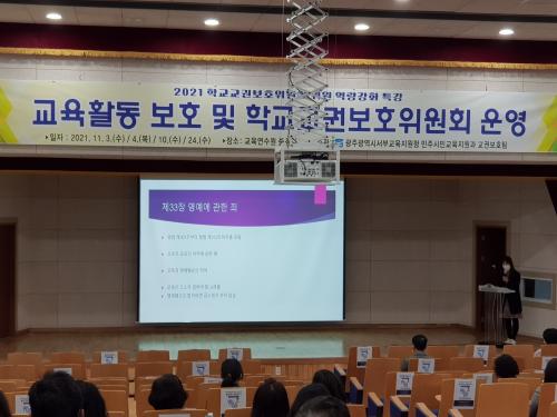 ±¤ÁÖ¼ºÎ±³À°Áö¿øÃ»Àº Ư° °»ç·Î ¹ý¹«¹ýÀÎ Á¦½Â ±è¹ÎÁö º¯È£»ç¿Í Á¶¼±´ë °±¤¹Î ±³¼ö¸¦ ÃÊûÇß´Ù. ¸ÕÀú ±è¹ÎÁö º¯È£»ç´Â µüµüÇÑ ¹ý·ü ¿ë¾î¸¦ ¾Ë±â ½±°Ô Ç®ÀÌÇÏ¸ç ±³À°È°µ¿ Ä§ÇØÀÇ °³³ä ¹× À¯Çüº° ´ëÀÀ ¹æ¾È¿¡ ´ëÇØ °¿¬Çß´Ù. ÀÌ¾î °±¤¹Î ±³¼ö°¡ ¡®ºñÀüÀ» °¡Áö°í ÇൿÇÏ¸é ±âÀûÀÌ ÀϾ١¯¸¦ ÁÖÁ¦·Î °¨µ¿À» ÁÖ´Â ¼ÒÅëÀÇ ¸®´õ½Ê¿¡ ´ëÇØ °ÀÇÇß´Ù.