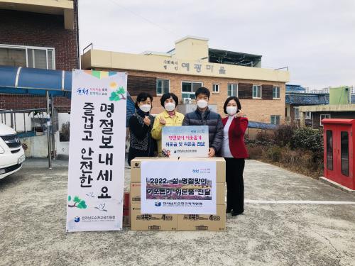 Àü¶ó³²µµ¼øÃµ±³À°Áö¿øÃ»(±³À°Àå ÀÌ¿ë´ö)Àº ¼³ ¸íÀýÀ» ¸Â¾Æ ÀÌ¿ô°ú ÇÔ²² ÇÏ´Â µû¶æÇÑ ¸íÀý ºÐÀ§±â Á¶¼ºÀ» À§ÇØ 25Àϰú 27ÀÏ ÀÌÆ²°£ »çȸº¹Áö½Ã¼³À» ¹æ¹®ÇØ À§¹®±Ý°ú À§¹®¹°Ç°À» Àü´ÞÇϰí, °ü³» Çб³ Çлý°¡Àå ¹× °¡Á¤À§Å¹Çлý 46¸í¿¡°Ô ºñ´ë¸é Åùè¹è¼ÛÀ» ÅëÇØ ¼ÒÁ¤ÀÇ Çö¹°À» Àü´ÞÇÏ¿´´Ù.