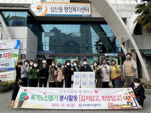 ¼øÃµÈ¿»ê°í(±³Àå ¹Ú¼º¿µ)´Â 12¿ù 16ÀÏ(±Ý)¿¡ »ç¶û°ú Çູ ³ª´©±â ÀÏȯÀ¸·Î Áö¿ª»çȸ¿Í ÇÔ²² ÇÏ´Â µ¶°Å³ëÀÎ µ½±â ¡®»ç¶û ´ã°í, Çູ ³ª´©´Â ±èÀå±èÄ¡ ´ã±×±â¡¯ Çà»ç¸¦ ÃßÁøÇÏ¿´´Ù°í ¹àÇû´Ù. ÀÌ Çà»ç´Â 2015³âºÎÅÍ Á¶¸®°ú¿Í ¿Ü½Ä°úÀÇ Çаú Ư¼ºÀ» »ì·Á Çлýµé¿¡°Ô »ç¶ûÀÇ ½Çõ°ú ³ª´®ÀÇ Á¤½ÅÀ» ÇÔ¾çÇϰí, Áö¿ª»çȸ¿¡ ´ëÇÑ »çȸÀû Ã¥ÀÓÀ» ±³À°ÇÔÀ¸·Î½á Áö¿ªÀÎÀç·Î ¼ºÀåÇÒ ¼ö ÀÖµµ·Ï 8³â° ÃßÁøÇØ ¿À°í ÀÖ´Ù.
