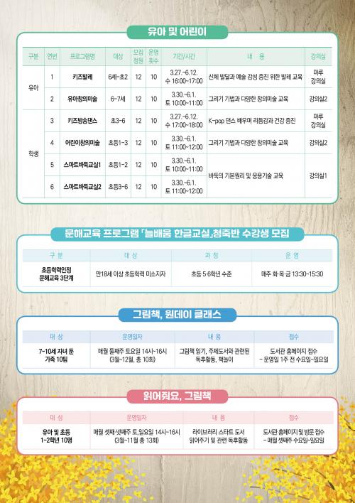 À̹ø ÇÁ·Î±×·¥Àº 3¿ù 26ÀϺÎÅÍ 6¿ù 13ÀϱîÁö ÃÑ 17°³ °ÁÂ(À¯¾Æ 2°³, Çлý 4°³, ¼ºÀÎ 11°³)¸¦ ¿î¿µÇÑ´Ù. ƯÈ÷ ÁֹΠ±âȹ °Á °ø°³ ¸ðÁýÀ» ÅëÇØ ¼±Á¤µÈ ¡®¿ìÄð·¼·¹¿Í º¸Äá¯, °³¼³ Èñ¸Á °Á ¼ö¿äÁ¶»ç¸¦ ¹Ý¿µÇÑ ¡®¹Ì¼ú»ç »êÃ¥¡¯, ¡®ÇÃ·çÆ®¡¯°Á¸¦ ½Å±Ô·Î ¿î¿µÇÒ ¿¹Á¤ÀÌ´Ù.