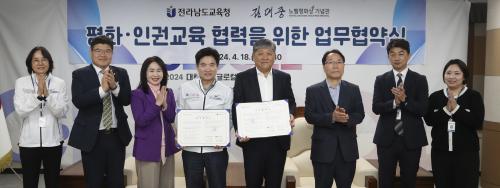 Àü¶ó³²µµ±³À°Ã»(±è´ëÁß±³À°°¨)°ú ±è´ëÁ߳뺧ÆòÈ»ó±â³ä°ü(°üÀå ±èµÎº¹)Àº 4¿ù 18ÀÏ Àü³²±³À°Ã»¿¡¼ ¹Ì·¡¼¼´ë ÆòÈ¡¤ÀαDZ³À°À» À§ÇÑ ¾÷¹«Çù¾àÀ» ¸Î¾ú´Ù.À̳¯ Çù¾à½ÄÀº ±è´ëÁß ±³À°°¨°ú ±èµÎº¹ ±è´ëÁ߳뺧ÆòÈ»ó±â³ä°üÀåÀ» ºñ·ÔÇÑ µÎ ±â°ü °ü°èÀÚµéÀÌ Âü¼®ÇÑ °¡¿îµ¥ ÁøÇàµÆ´Ù.