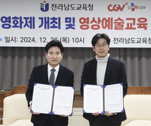 Àü¶ó³²µµ±³À°Ã»(±³À°°¨ ±è´ëÁß)°ú CJ CGV(´ëÇ¥ÀÌ»ç Çã¹Îȸ)´Â 26ÀÏ Àü³²±³À°Ã» ºñÁö´Ï½º½Ç¿¡¼­ ±Û·ÎÄà Çлý¿µÈ­Á¦ °³ÃÖ ¹× ¿µ»ó¿¹¼ú±³À° Ȱ¼ºÈ­¸¦ À§ÇÑ ¾÷¹«Çù¾àÀ» ü°áÇß´Ù.