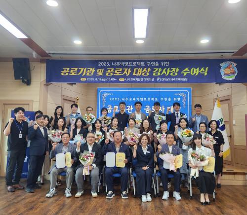 Àü¶ó³²µµ³ªÁÖ±³À°Áö¿øÃ»(±³À°Àå º¯Á¤ºó)Àº 9¿ù 12ÀÏ(±Ý) ¡®³ªÁÖ±³À° ºò¹ðÇÁ·ÎÁ§Æ®¡¯ ±¸ÇöÀ» À§ÇØ ÇÔ²²ÇÑ °ø°ø±â°ü, À¯°ü±â°ü ¹× °ü°èÀÚ 32¸í¿¡°Ô °¨»çÀåÀ» ¼ö¿©Çß´Ù.