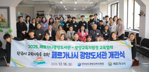 ¡®±¤¾çÇѱ¹¾î µµ¼­°ü¡¯Àº Æä¸£°¡³ª½Ã Áß¾Óµµ¼­°ü ³»¿¡ °³°üÇÏ¿´°í. ±¤¾ç±³À°Áö¿øÃ»¿¡¼­´Â K-Book(ÃʵîÇб³ ±³°ú¼­, µ¿È­Ã¥ µî) ¹× Çѱ¹ ÀüÅ빮ȭ ÇнÀ¿ë ±³±¸¸¦ ±âÁõÇÏ¿© ºñÄ¡Çß´Ù. µµ¼­°ü¿¡ ±âÁõµÈ 1,000±ÇÀÇ µµ¼­´Â ±¤¾ç °ü³» 30°³ Çб³°¡ ÇÔ²² Âü¿©ÇÑ ±³À° ±âºÎÀÌÀÚ, 2¸¸¿© ¸íÀÇ ±³Á÷¿øÀÌ °ü½É°ú ÀÀ¿øÀ» ´ã¾Æ ¸¶·ÃÇÑ °ÍÀ¸·Î ±× Àǹ̸¦ ´õÇß´Ù.