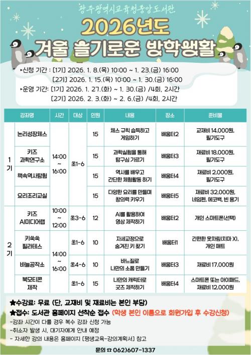 ±¤ÁÖÁß¾Óµµ¼°ü, ¡®°Ü¿ï ½½±â·Î¿î ¹æÇлýȰ¡¯ ¿î¿µ 1¿ù 27ÀÏ~2¿ù 6ÀÏ °úÇС¤AI¡¤ÇʶóÅ×½º µî 8°³ üÇè °Á ÃʵîÇлý 107¸í ¸ðÁý¡¦23ÀÏ(1±â)¡¤30ÀÏ(2±â), ´©¸®Áý¼ ½Åû