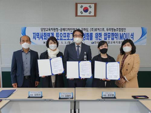 ´ã¾ç±³À°Áö¿øÃ»(±³À°Àå ±èöÁÖ) Çб³Áö¿ø¼¾ÅÍ´Â 3ÀÏ Áö¿ª»çȸ¿¬°è Åä¿äÇÁ·Î±×·¥ Ȱ¼ºÈ¸¦ À§ÇØ °ø¿¹µðÀÚÀבּ¸½Ç ±ÝÇÏ´ç(´ëÇ¥ ±è¹Ì¼±) ¹× ÁÖ½Äȸ»ç ·ÎÄ¿½ºÆ®(´ëÇ¥ ÀåÀº¿µ), µÎ¸®¿µ³óÁ¶ÇÕ¹ýÀÎ(´ëÇ¥ ±è»ó½Ä)°ú ¾÷¹«Çù¾à(MOU)À» ü°áÇß´Ù.