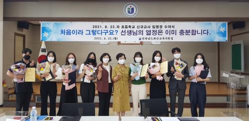 Äڷγª19 ¹æ¿ª ¼öÄ¢À» ÁؼöÇϸç ÀÓ¸íÀå ¼ö¿©, ¼±¼¹® ³¶µ¶, ±³À°Àå°úÀÇ °£´ãȸ ¼øÀ¸·Î ÁøÇàµÇ¾ú´Ù. ½Å±Ô±³»çµéÀº ù ºÎÀÓÁö°¡ ±âÀçµÈ ÀÓ¸íÀå°ú ÃàÇÏ ²É´Ù¹ßÀ» ¹Þ°í ±¹¹Î¿¡ ´ëÇÑ ºÀ»çÀڷμÀÇ ÀÓ¹«¸¦ ¼º½ÇÈ÷ ¼öÇàÇÒ °ÍÀ» ¾ö¼÷È÷ ¼±¼ÇÑ ÈÄ ¼±¼¹®À» ³¶µ¶ÇÏ°í ±³À°Àå¿¡°Ô Àü´ÞÇß´Ù. ¶ÇÇÑ ±³À°Àå°úÀÇ °£´ãȸ¸¦ ÅëÇØ ±³À°°ø¹«¿øÀ¸·Î¼ °®Ãç¾ß ÇÒ º¹¹« ÀÚ¼¼ ¹× ÁßÁ¡ ±³À°È°µ¿À» ÀÚÀ¯·Ó°Ô ÇùÀÇÇß´Ù.