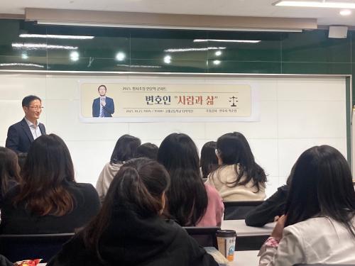 10¿ù 23ÀÏ¿¡´Â ¹ÚÁØ¿µ º¯È£»ç¸¦ ÃÊûÇÏ¿© <º¯È£ÀÎ: »ç¶÷°ú »î>À» ÁÖÁ¦·Î °­¿¬À» ÁøÇàÇÏ¿´´Ù. °­¿¬Àº º¯È£ÀÎÀ¸·Î½áÀÇ »î°ú »ç°Çµé»Ó¸¸ ¾Æ´Ï¶ó µ¿¹°³óÀåÀÇ ÁÖÀΰøÀ» ÇÔ²² ´Ù·ç¾î ÇлýµéÀÇ Èï¹Ì¿Í Ã¥¿¡ ´ëÇÑ ÀÌÇØ¸¦ ³ô¿´À¸¸ç, µ¿¹°µéÀ» Çö »çȸ¿Í ¿¬°áÁö¾î »ý°¢Çغ¸´Â °è±â¸¦ ¸¶·ÃÇß´Ù.