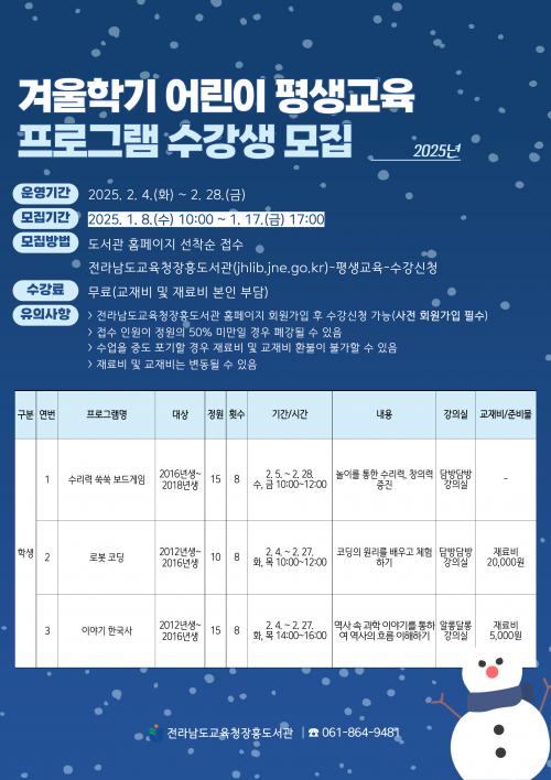 À̹ø °Ü¿ïÇб⿡´Â ¡ã¼ö¸®·Â ¾¦¾¦ º¸µå°ÔÀÓ(1~3Çгâ) ¡ã·Îº¿ ÄÚµù(3~6Çгâ) ¡ãÀ̾߱â Çѱ¹»ç(3~6Çгâ) ÃÑ 3°³ ÇÁ·Î±×·¥ÀÌ ¿î¿µµÈ´Ù.